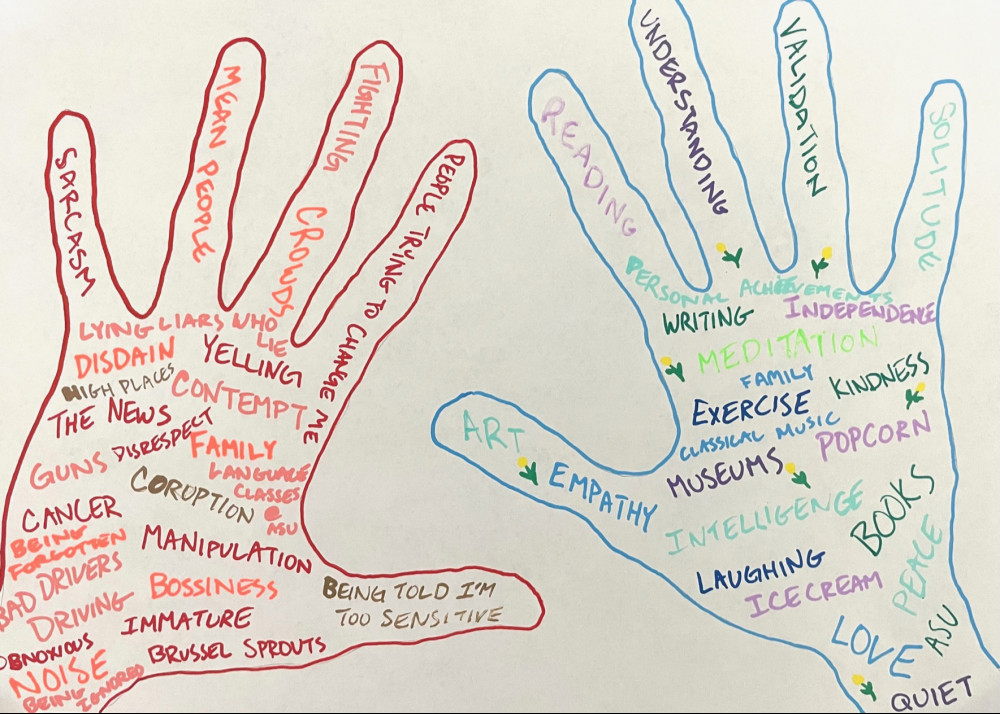 This is another activity I did with my family. For me personally, I would have to say I probably enjoyed the “Harmful Hand” more than the Helping Hand. Usually, when we do art therapy activities together, we do ones that center around more positivity or comfort. That’s what the Helping Hand is about. And it’s nice to find out what comforts you. But having the Harmful Hand was different because it focused more on saying: